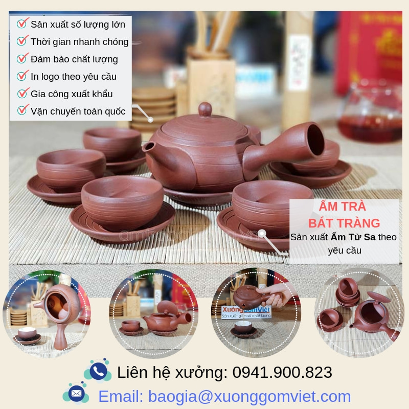 Xưởng Ấm Trà Bát Tràng In Logo (amtrabattrang.vn) chuyên sản xuất bộ ấm chén gốm sứ Bát Tràng in logo số lượng lớn làm quà tặng cho doanh nghiệp, cơ quan, đoàn thể. Bộ sưu tập ấm trà đa dạng: men trắng, men màu, tử sa, hỏa biến, vẽ tay, hoạ tiết decal cùng dịch vụ in logo theo yêu cầu. Cam kết giá tận xưởng, chất lượng chính hãng, giao hàng nhanh toàn quốc và đổi trả linh hoạt.